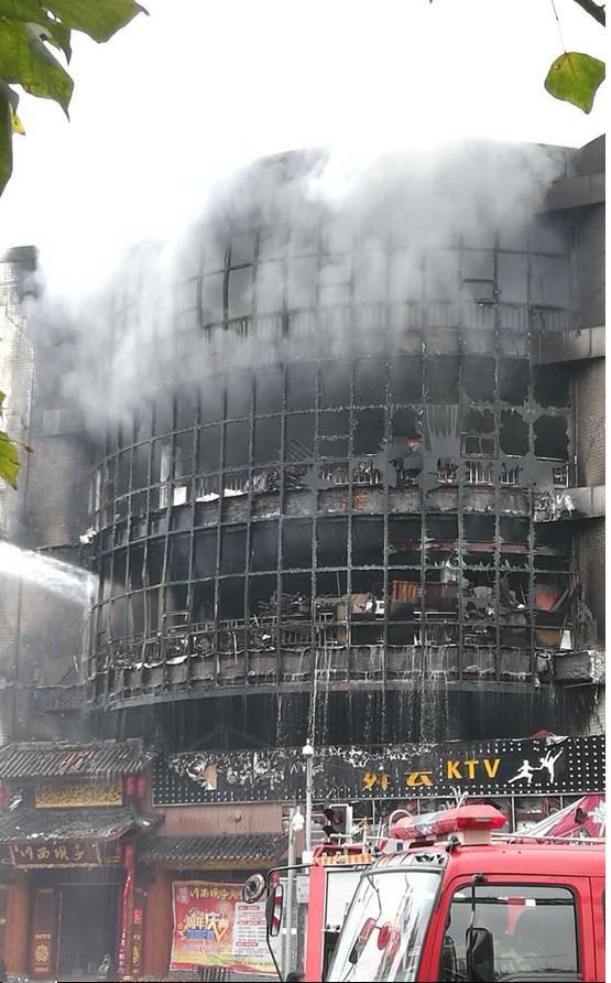 煙,樓房的外表已經(jīng)被全部燒黑。6臺(tái)云梯消防車分布在大樓的四周,一起向大樓